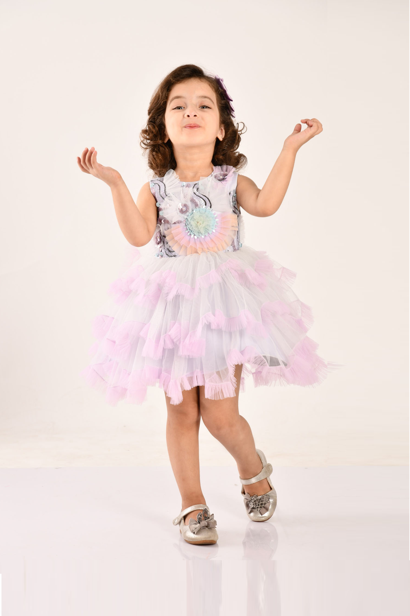 Ensure your little one looks nothing short of fabulous in our gorgeous 'Candy Cloud Dress.' This stunning ruffled tulle dress, featuring beautiful shades of lavender and blue, comes to life with hand-embroidered sequined flowers and delicately scattered beads on the bodice. Luxuriously lined with soft satin , ‘Candy Cloud not only makes a chic statement but ensures your little girl looks irresistibly cute while staying delightfully comfortable.