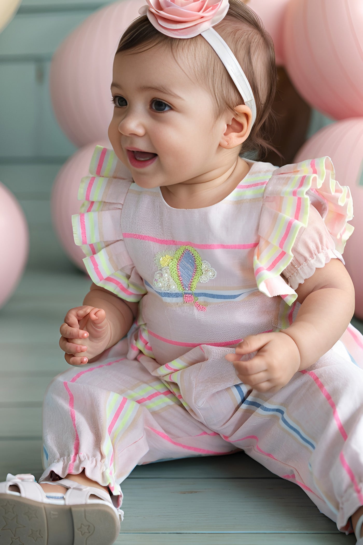 Absolutely enchanting! Your little explorer will shine in our "Cloud Hopper jumpsuit ," handmade with utmost care in soft pastel pink cotton with vibrant stripes. The stunning hot air balloon embroidery is sure to captivate hearts. This summer-friendly playsuit is perfect for your little one's adventures, ensuring both style and comfort. Being picture-perfect is a breeze with Sunny Side Up's newest collection—let your little fashionista flaunt the cutest of styles!