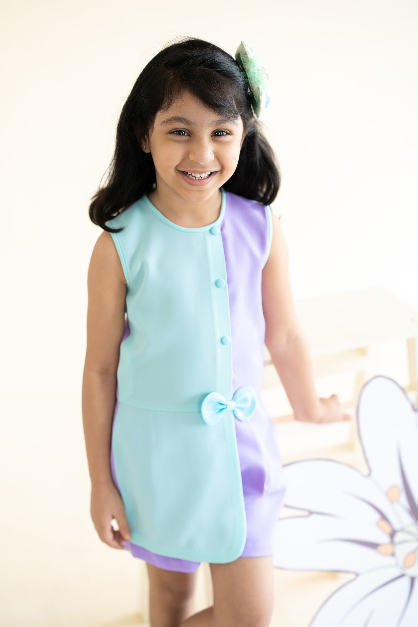 Let your little one stand out in this trendy playsuit, the thoughtful design ensures both style and comfort . With its vibrant violet  and aqua  palette, finished with a  bow and buttons , this chic playsuit is designed for explorations and joyful escapades. Let your little one roam freely in comfort and style, embracing every adventure with a touch of playful elegance.