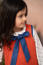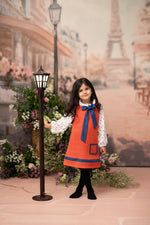 Celebrate the season in style with Autumn in Paris, a structured pumpkin suede dress with sophisticated blue accents and a charming bow. Paired with a soft polka-dot blouse, this ensemble combines polished design with subtle playful touches, perfect for festive gatherings or everyday elegance.