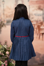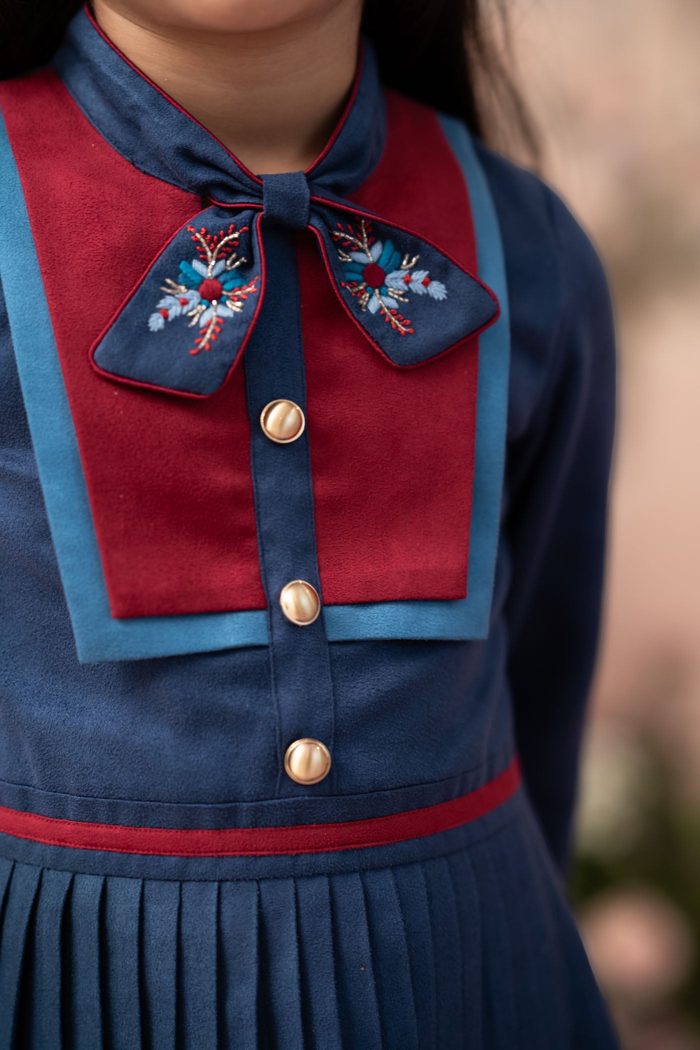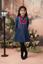 Step into a moonlit tale with Midnight Blueberry, a Parisian-inspired dream in deep steel blue suede. The structured bodice is framed with rich cherry panels, highlighted by elegant gold buttons that evoke classic charm. A dainty bow collar with delicate floral embroidery adds a whisper of festive sweetness. The cascade pleated skirt flows with timeless grace, while soft balloon sleeves lend a vintage touch.
