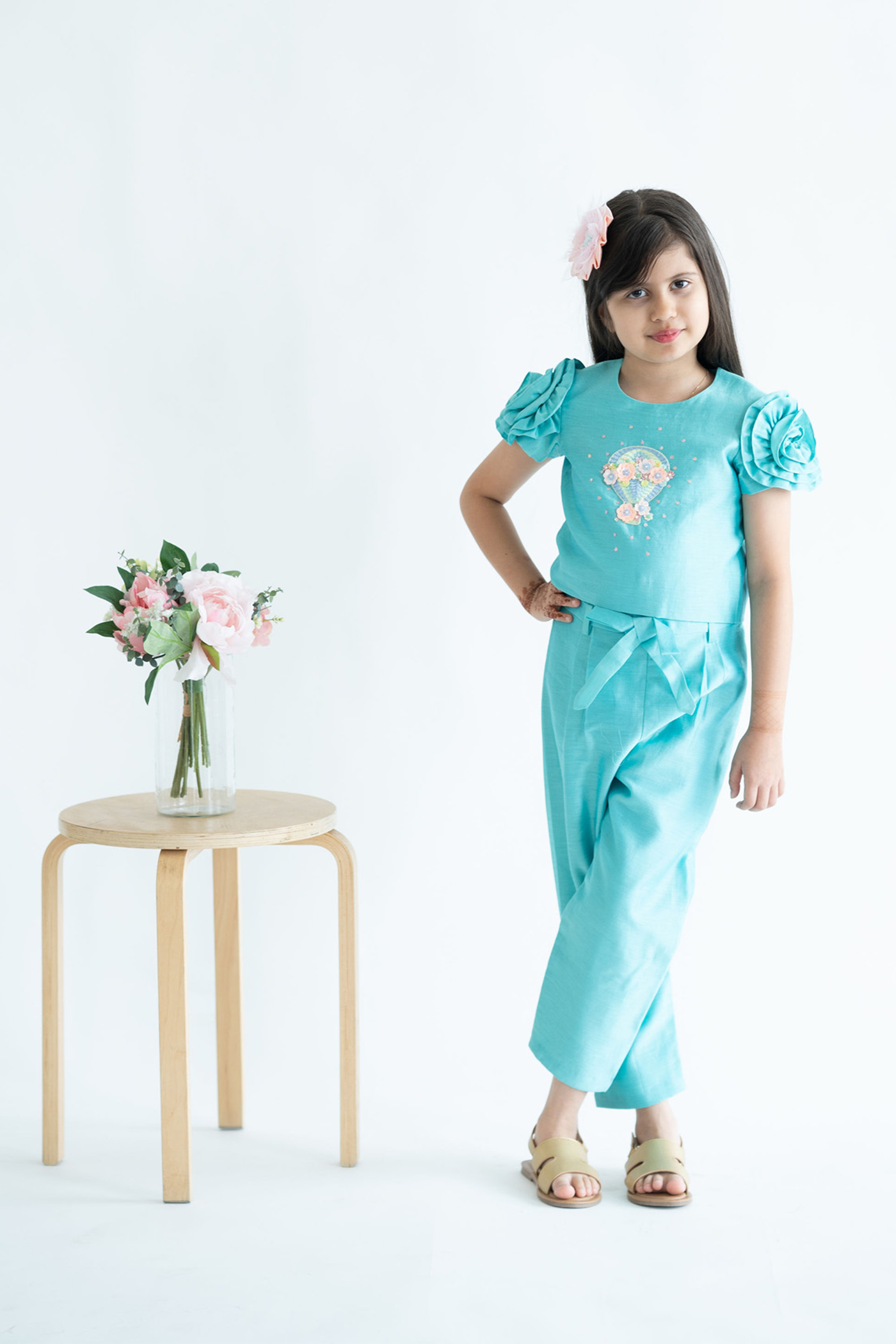 Let your angel look nothing short of fabulous in our meticulously crafted 'hot air balloon Coord Set.' The refined top features intricate hot air balloon embroidery, while ruffles add to the charm of the sleeves . The comfortable pants are complemented with a chic bow, making it perfect for play area dates to evening get-togethers. This set ensures your little one is both stylish and comfortable for any occasion! Elaborate on garment descriptions