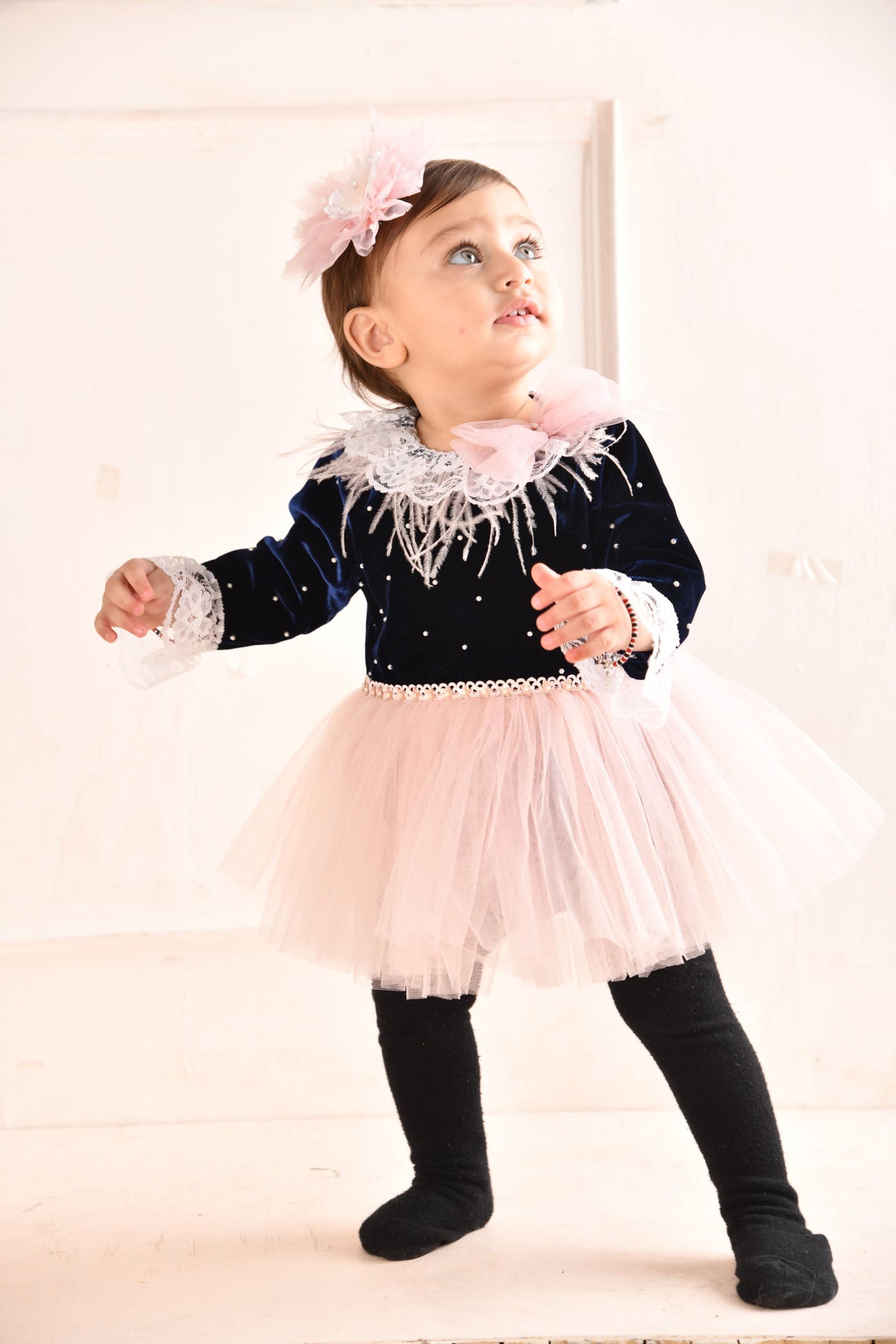 Tiny pearls sprinkled on a chic navy velvet with beautiful lace and feather on the neck and sleeves , finished with a gorgeous tulle and pearl bow . Luxuriously lined with satin.