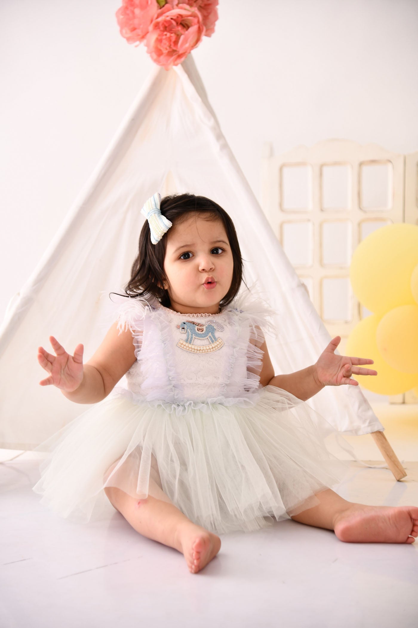Indulge in the enchantment of our "Twinkle Dust" tutu, handcrafted with love and oodles of sea green tulle. This soft, luxurious tutu boasts an intricately embroidered rocking horse adorned with pearls and beads, promising to captivate you. Meticulously crafted in soft lace and satin, it ensures a comfortable wear for your little fashionista. Let your darling twirl in elegance and joy with this intricately designed tutu dress, a perfect blend of charm and comfort.