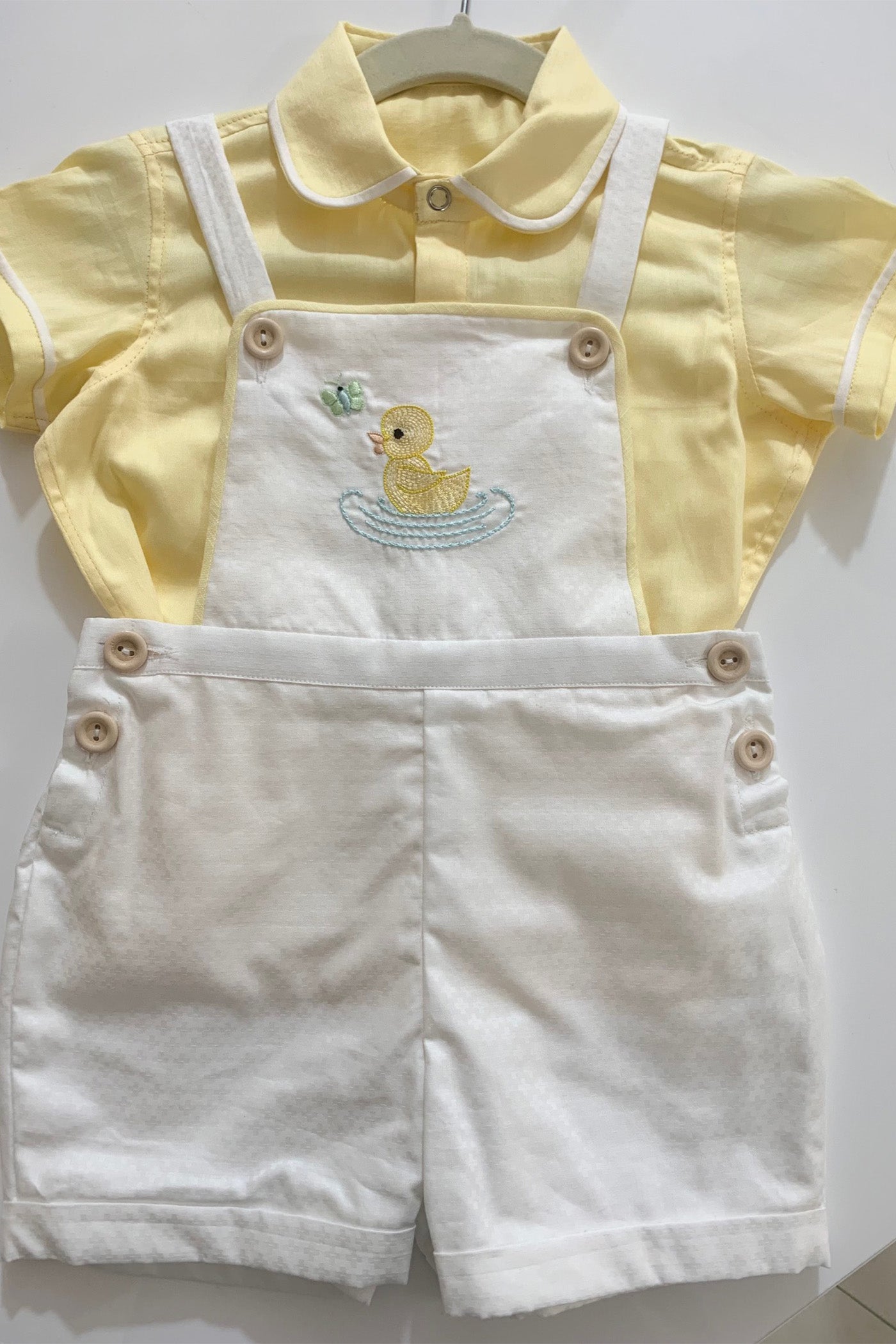 Let your little one waddle into the world of fashion with our charming 'Quack-tastic Romper Set.' This adorable ensemble features a pale yellow shirt, beautifully accented with ivory detailing on the collar and sleeves, adding a touch of classic charm to the outfit.