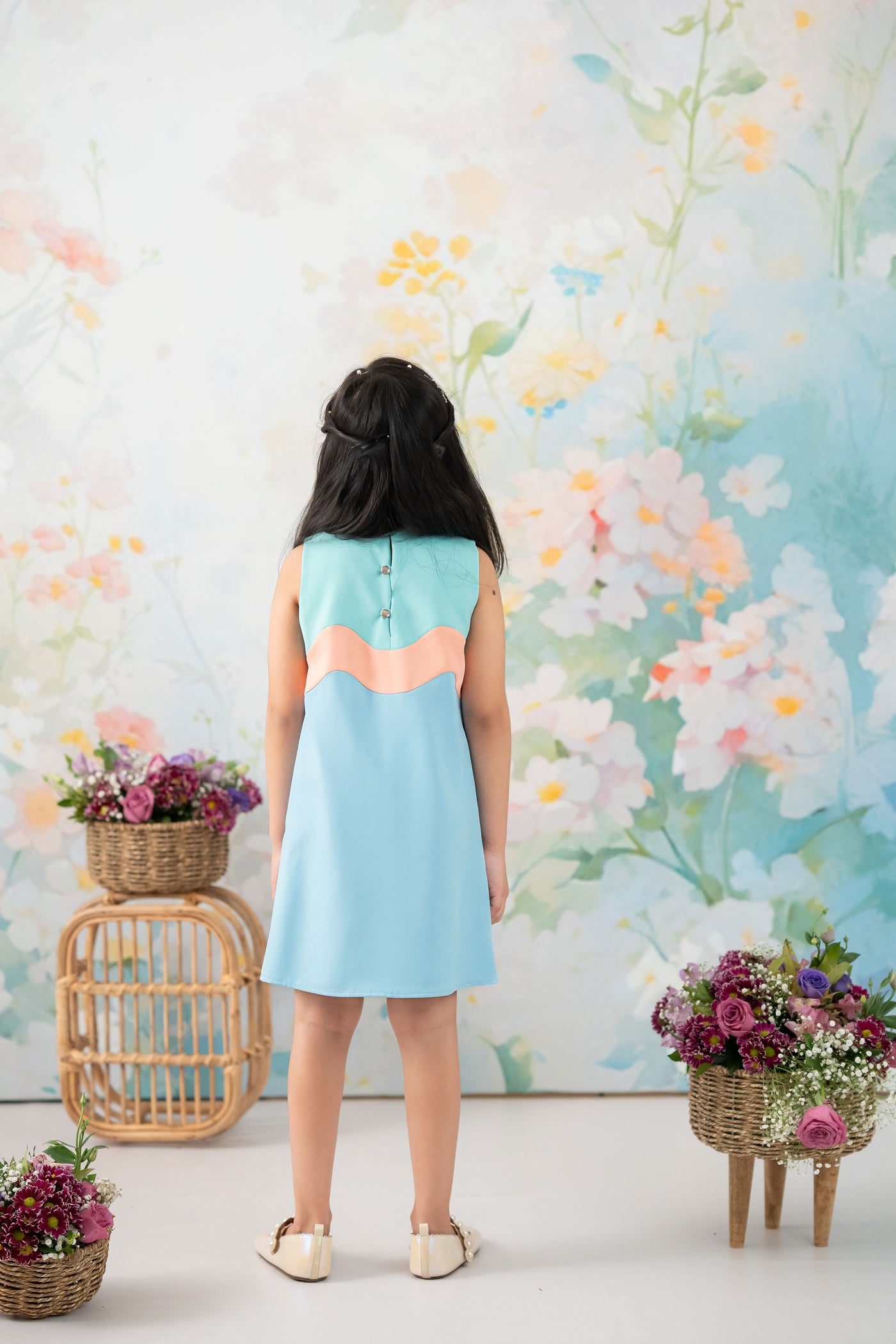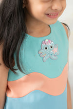 Bright, playful, and full of personality, the Little Gratitude Dress is a delightful celebration of colour and craftsmanship. Designed with a beautiful pop of soothing pastels, this dress features a charming hand-embroidered octopus motif that adds a playful yet refined touch. Delicately scattered pearls on the yoke enhance its elegance, while the thoughtfully colour-blocked design brings a fresh, modern appeal. Crafted for comfort as much as style, the dress is cotton lined for a soft feel against the skin and tailored with a side zipper and back buttons for easy, fuss-free wear. Perfect for aqua-themed celebrations, pool parties, and sunny special occasions, the Little Gratitude Dress brings joyful elegance to every moment—made to spark smiles and sweet memories.